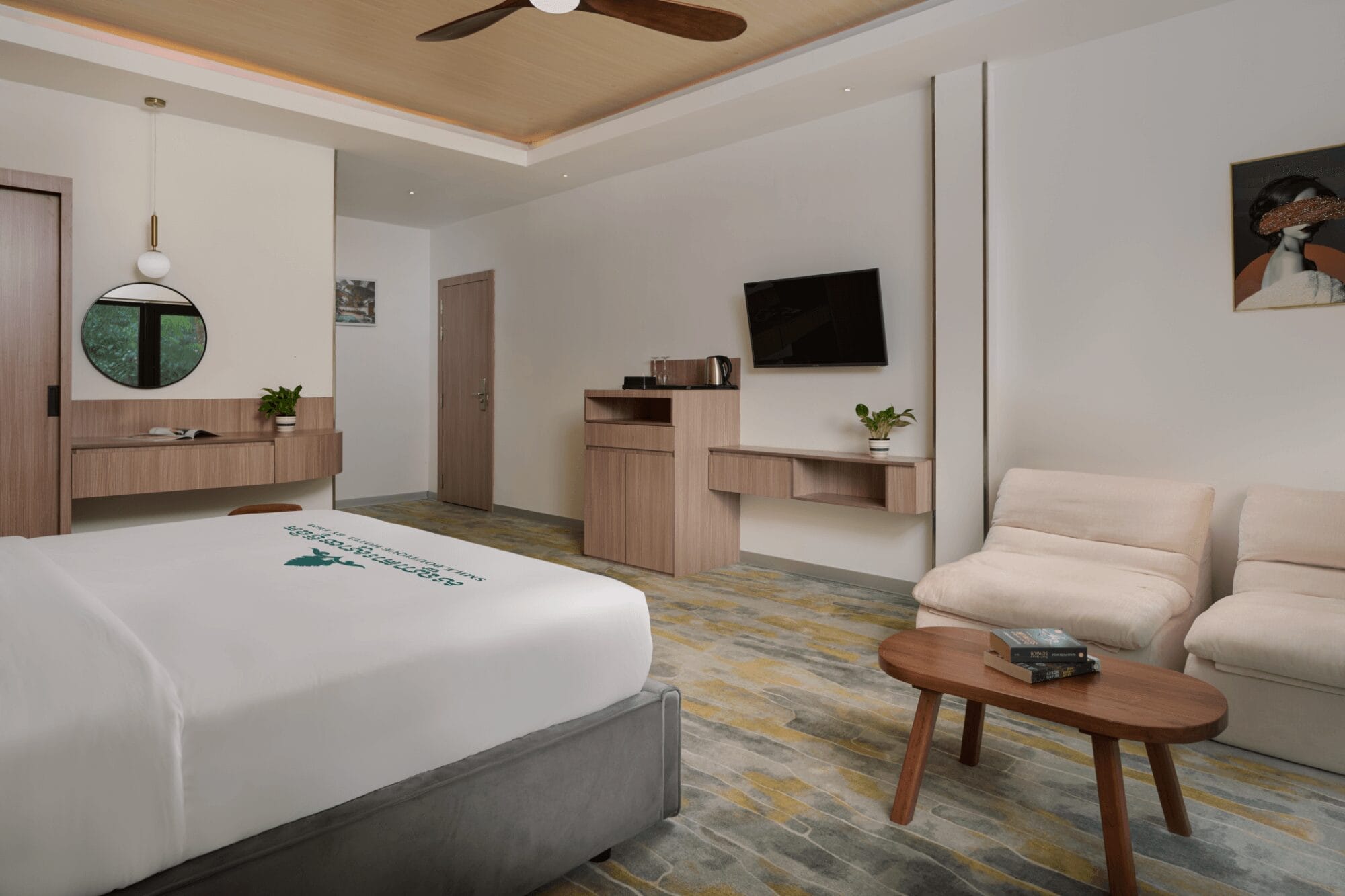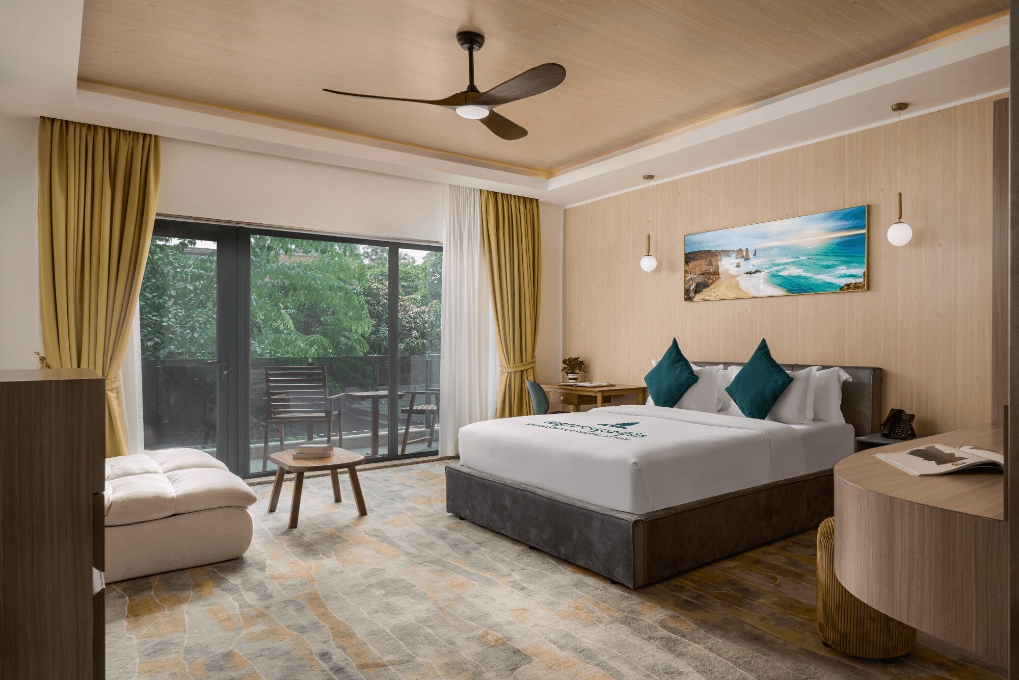 Relax in our 49 sqm Deluxe Double with Balcony, featuring a choice of ceiling fan or air conditioning, a pair of floor lounge chairs, and a private balcony for fresh air.